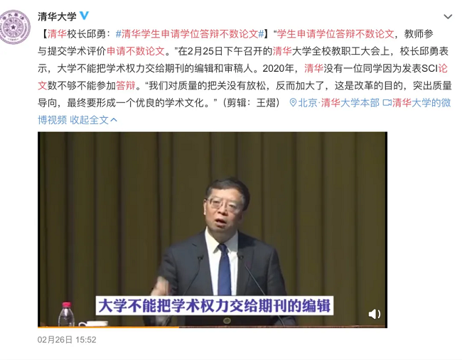 邱勇表示,2020年,没有一个清华学生因发表SCI论文数量不够,而无法申请学位。但,这并非放松毕业要求。相反,对数量要求下降,就意味着对论文质量要求的提升。邱勇认为,这是高校改革的目的所在:大学不能把学术权力,交给期刊编辑和审稿人。