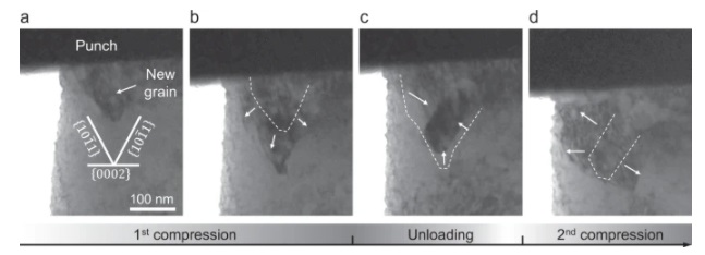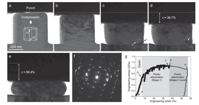 图 1:亚微米镁单晶柱在c轴压缩下均匀变形,然后在应变爆发中变平。压缩前的初始支柱。插图六边形晶胞显示加载方向。观察方向,。b位错的形成和运动。c在柱子的右下角形成了一个新的颗粒(白色箭头)。d新晶粒中出现暗对比,表明内部有错位或孪晶活动。e柱子突然变平。f从展平样品中获得的选定区域衍射图案。g显示两阶段塑性变形的相应应力-应变曲线