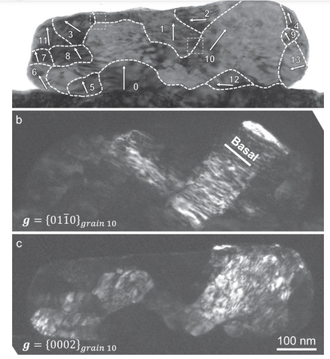 导读:镁是最轻的结构金属,当沿其结晶c轴(镁的“硬”取向)压缩时,通常表现出有限的可塑性。本文报道了亚微米镁单晶在c轴压缩中通过双阶段变形获得的大塑性。当塑性流动逐渐将镁晶体应变硬化到千兆帕斯卡水平时,此时位错介导的塑性几乎耗尽,样品立即变成饼而没有断裂,伴随着初始单晶转化为大致共享一个共同的旋转轴。新晶粒可以通过锥体向基面的转变而形成。我们将这种晶粒形成归类为“变形晶粒”。新晶粒的形成使大量位错滑移和变形孪晶恢复活力,从而产生大的塑性应变。
