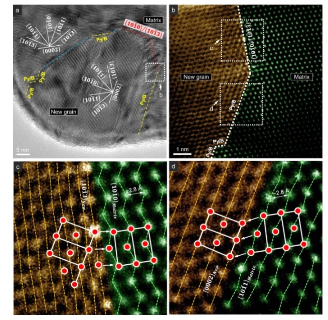 图 5:c轴压缩过程中形成的纳米级新晶粒核的边界结构。