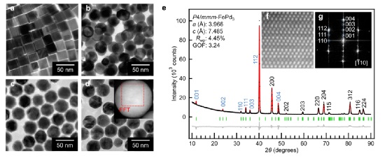 图 1。含少量In的单分散Fe-Pd合金NPs的合成及表征。a-d, 23 nm Pd NPs的TEM图像.