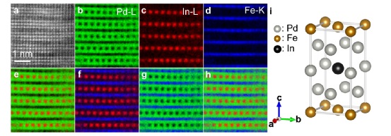 图 2。图2直接观察原子在 z3型结构中的情况。A-d,haadf-stem 映像(a)和 z3型结构的元素映射(pd-l (b) ,in-l (c)和 fe-k (d))。E-h、 b 与 c (e)、 c 与 d (f)、 b 与 d (g)及 b-d (h)重叠。从图1e-g 和图2a-h 测定了 z3-fe (pd,ind)3的单元。