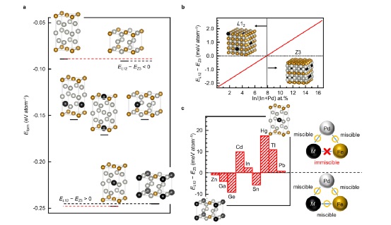 为了创建一种具有如补充图1所示的分层结构的原子排列的有序合金,本文注意了元素间的混溶性——在二元合金相图8中,两种元素在原子水平上的混溶性。近年来,通过引入和收回填隙N原子,实现了A1-向L10-FeNi结构的转变。在此过程中形成的Fe - Ni - N化合物具有单晶胞结构,该单晶胞由一层Fe - N层夹两层Ni层组成,反映了Fe与N较好的结合亲和性,例如Fe催化剂的N2解离作用。这种由间隙N与 Fe、 Ni 的元素间亲和力引起的结构转变,启发我们类比地认为,二元合金由已知结构向未知结构的转变,可以通过二元合金中取代的第三元素与两种元素的混溶性的差异来实现。