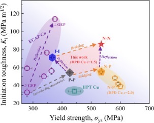 图 9.屈服强度之间的关系(σys)和初始断裂韧性(Ki)对于不同裂解方向(即N-N、I-I、N-P和P-P)下的HNS Cu(DPD Cu ε=1.5),与不同裂解方向下的ECAP Cu进行比较(⊥GEP和∥GEP分别表示与晶粒伸长平面(GEP)垂直和平行的裂纹平面、高压扭转(HPT)Cu [60]和DPD铜(ε=2.0)在N-P方向上具有不同的NTB长度。