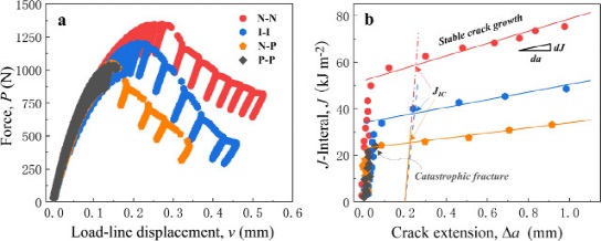 图 3.(a) 不同方向的力与载荷线位移曲线。应用卸载顺应性技术来确定瞬时裂纹长度。(b) J 积分的变化作为根据(a)中的数据计算的裂纹延伸的函数。